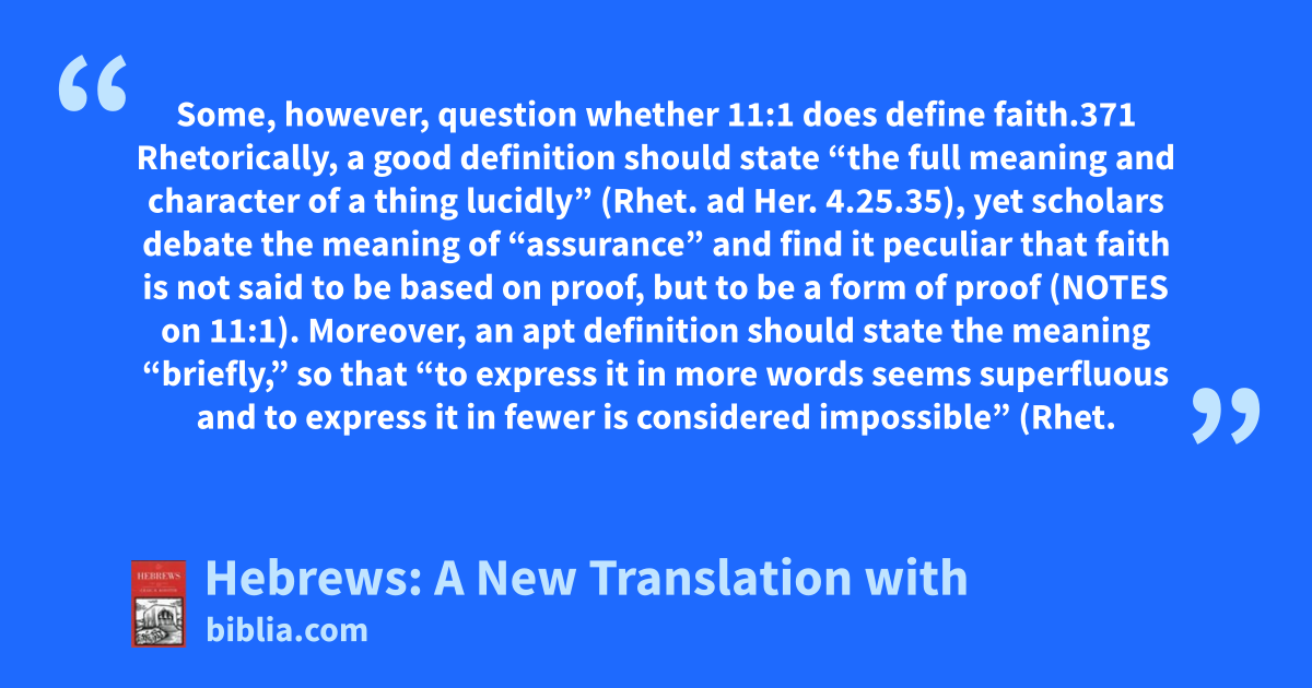 Some, however, question whether 11:1 does define faith.371 Rhetorically, a good definition should state “the full meaning and character of a thing lucidly” (Rhet. ad Her. 4.25.35), yet scholars debate the meaning of “assurance” and find it peculiar that faith is not said to be based on proof, but to be a form of proof (NOTES on 11:1). Moreover, an apt definition should state the meaning “briefly,” so that “to express it in more words seems superfluous and to express it in fewer is considered impossible” (Rhet.