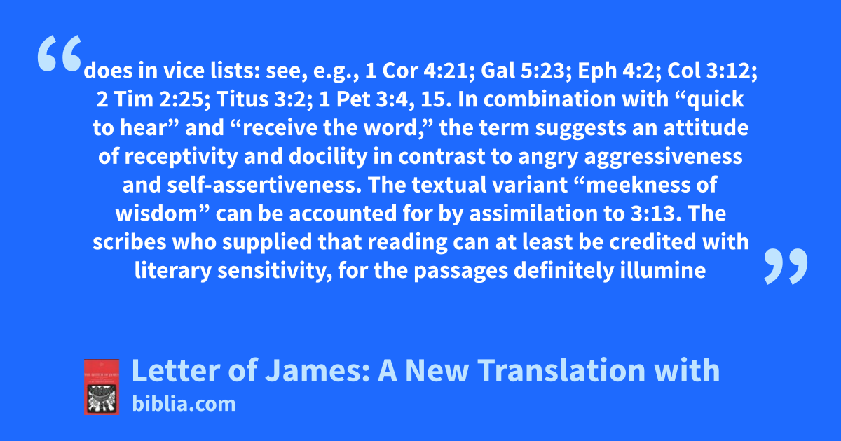does in vice lists: see, e.g., 1 Cor 4:21; Gal 5:23; Eph 4:2; Col 3:12; 2 Tim 2:25; Titus 3:2; 1 Pet 3:4, 15. In combination with “quick to hear” and “receive the word,” the term suggests an attitude of receptivity and docility in contrast to angry aggressiveness and self-assertiveness. The textual variant “meekness of wisdom” can be accounted for by assimilation to 3:13. The scribes who supplied that reading can at least be credited with literary sensitivity, for the passages definitely illumine