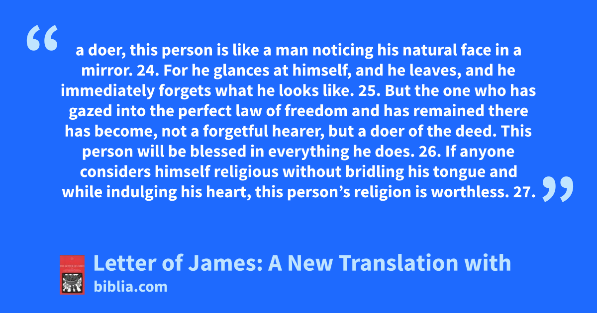 a doer, this person is like a man noticing his natural face in a mirror. 24. For he glances at himself, and he leaves, and he immediately forgets what he looks like. 25. But the one who has gazed into the perfect law of freedom and has remained there has become, not a forgetful hearer, but a doer of the deed. This person will be blessed in everything he does. 26. If anyone considers himself religious without bridling his tongue and while indulging his heart, this person’s religion is worthless. 27.