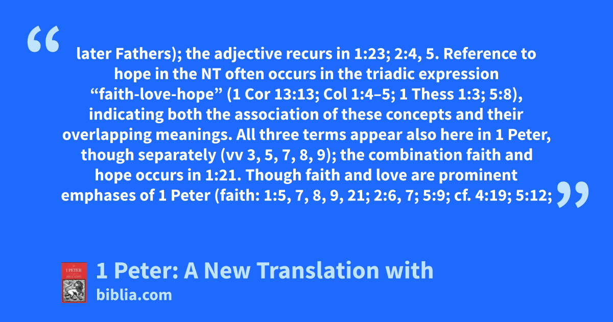 later Fathers); the adjective recurs in 1:23; 2:4, 5. Reference to hope in the NT often occurs in the triadic expression “faith-love-hope” (1 Cor 13:13; Col 1:4–5; 1 Thess 1:3; 5:8), indicating both the association of these concepts and their overlapping meanings. All three terms appear also here in 1 Peter, though separately (vv 3, 5, 7, 8, 9); the combination faith and hope occurs in 1:21. Though faith and love are prominent emphases of 1 Peter (faith: 1:5, 7, 8, 9, 21; 2:6, 7; 5:9; cf. 4:19; 5:12;