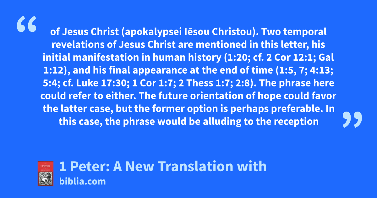 of Jesus Christ (apokalypsei Iēsou Christou). Two temporal revelations of Jesus Christ are mentioned in this letter, his initial manifestation in human history (1:20; cf. 2 Cor 12:1; Gal 1:12), and his final appearance at the end of time (1:5, 7; 4:13; 5:4; cf. Luke 17:30; 1 Cor 1:7; 2 Thess 1:7; 2:8). The phrase here could refer to either. The future orientation of hope could favor the latter case, but the former option is perhaps preferable. In this case, the phrase would be alluding to the reception