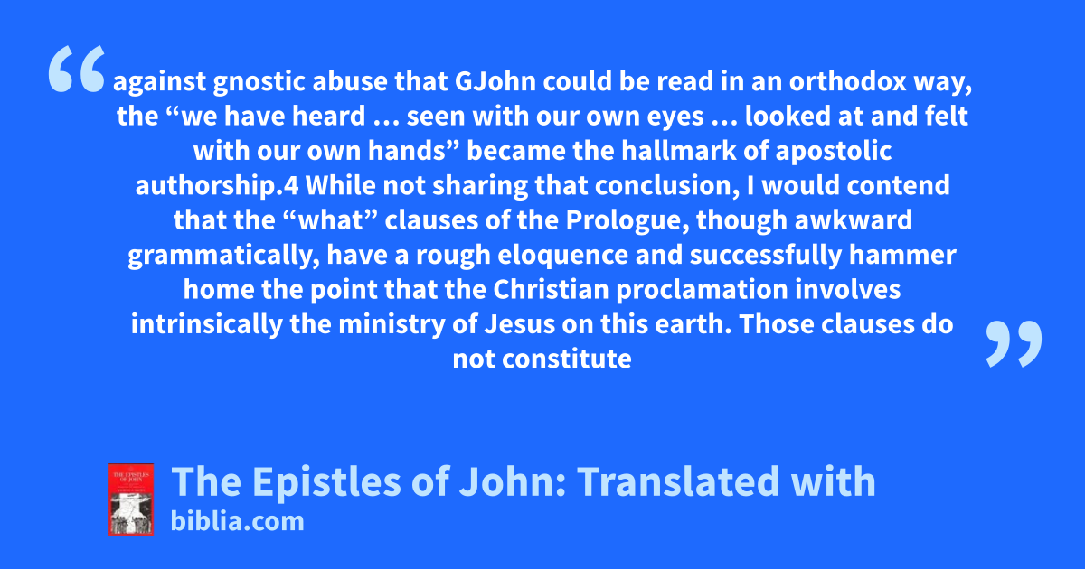 against gnostic abuse that GJohn could be read in an orthodox way, the “we have heard … seen with our own eyes … looked at and felt with our own hands” became the hallmark of apostolic authorship.4 While not sharing that conclusion, I would contend that the “what” clauses of the Prologue, though awkward grammatically, have a rough eloquence and successfully hammer home the point that the Christian proclamation involves intrinsically the ministry of Jesus on this earth. Those clauses do not constitute