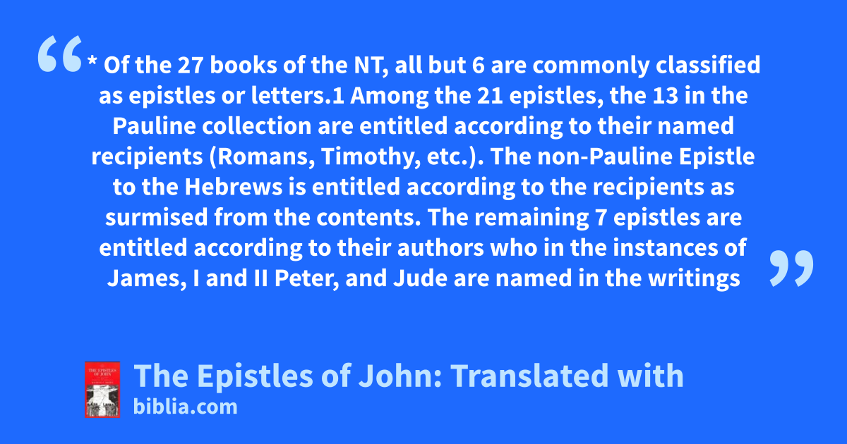 * Of the 27 books of the NT, all but 6 are commonly classified as epistles or letters.1 Among the 21 epistles, the 13 in the Pauline collection are entitled according to their named recipients (Romans, Timothy, etc.). The non-Pauline Epistle to the Hebrews is entitled according to the recipients as surmised from the contents. The remaining 7 epistles are entitled according to their authors who in the instances of James, I and II Peter, and Jude are named in the writings