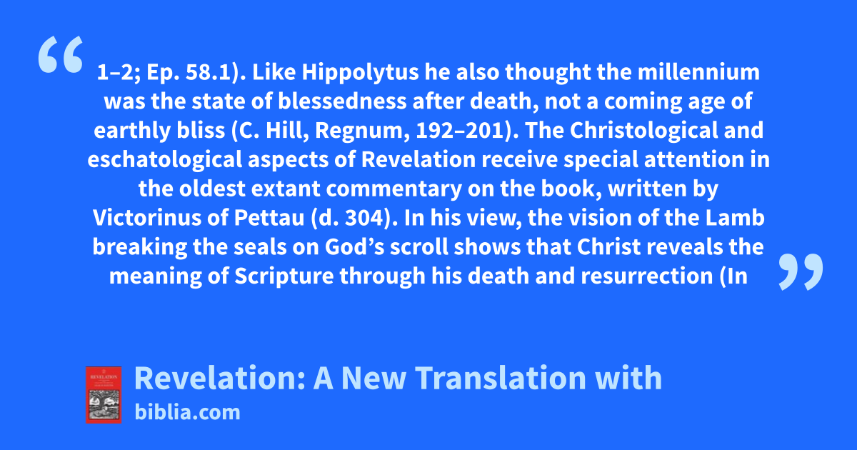 1–2; Ep. 58.1). Like Hippolytus he also thought the millennium was the state of blessedness after death, not a coming age of earthly bliss (C. Hill, Regnum, 192–201). The Christological and eschatological aspects of Revelation receive special attention in the oldest extant commentary on the book, written by Victorinus of Pettau (d. 304). In his view, the vision of the Lamb breaking the seals on God’s scroll shows that Christ reveals the meaning of Scripture through his death and resurrection (In