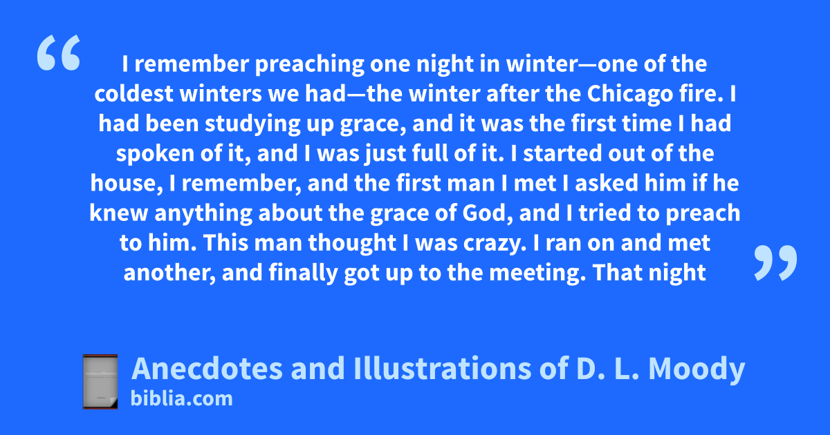 I remember preaching one night in winter—one of the coldest winters we had—the winter after the Chicago fire. I had been studying up grace, and it was the first time I had spoken of it, and I was just full of it. I started out of the house, I remember, and the first man I met I asked him if he knew anything about the grace of God, and I tried to preach to him. This man thought I was crazy. I ran on and met another, and finally got up to the meeting. That night