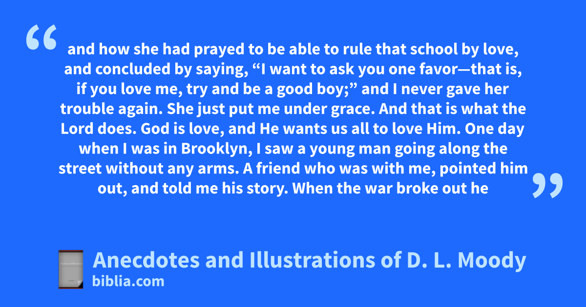 and how she had prayed to be able to rule that school by love, and concluded by saying, “I want to ask you one favor—that is, if you love me, try and be a good boy;” and I never gave her trouble again. She just put me under grace. And that is what the Lord does. God is love, and He wants us all to love Him. One day when I was in Brooklyn, I saw a young man going along the street without any arms. A friend who was with me, pointed him out, and told me his story. When the war broke out he