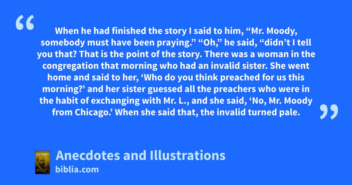 When he had finished the story I said to him, “Mr. Moody, somebody must have been praying.” “Oh,” he said, “didn’t I tell you that? That is the point of the story. There was a woman in the congregation that morning who had an invalid sister. She went home and said to her, ‘Who do you think preached for us this morning?’ and her sister guessed all the preachers who were in the habit of exchanging with Mr. L., and she said, ‘No, Mr. Moody from Chicago.’ When she said that, the invalid turned pale.