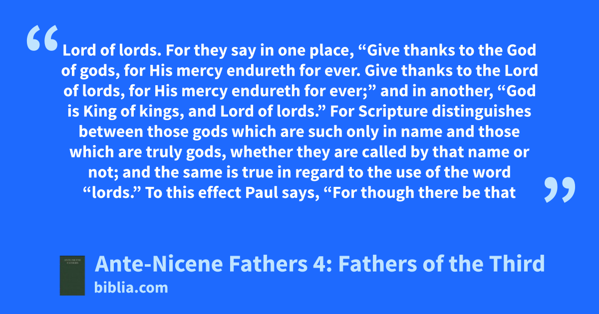 Lord of lords. For they say in one place, “Give thanks to the God of gods, for His mercy endureth for ever. Give thanks to the Lord of lords, for His mercy endureth for ever;” and in another, “God is King of kings, and Lord of lords.” For Scripture distinguishes between those gods which are such only in name and those which are truly gods, whether they are called by that name or not; and the same is true in regard to the use of the word “lords.” To this effect Paul says, “For though there be that