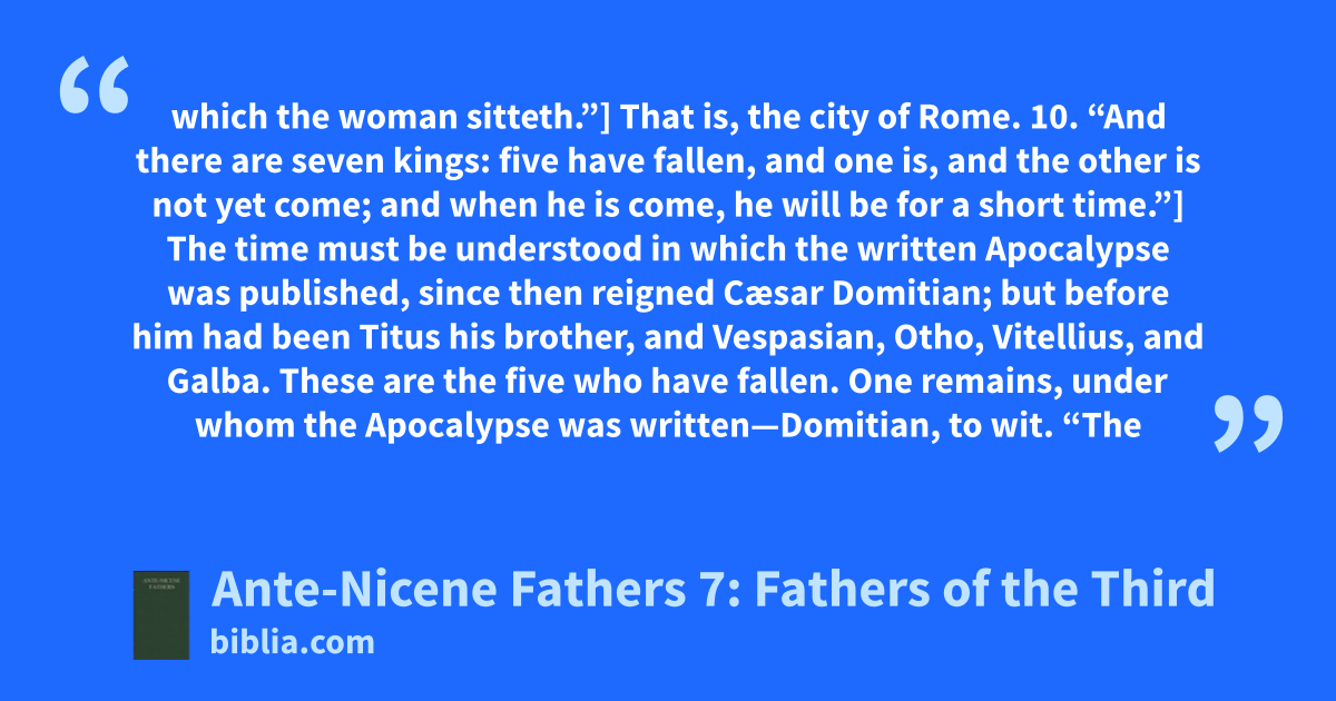 which the woman sitteth.”] That is, the city of Rome. 10. “And there are seven kings: five have fallen, and one is, and the other is not yet come; and when he is come, he will be for a short time.”] The time must be understood in which the written Apocalypse was published, since then reigned Cæsar Domitian; but before him had been Titus his brother, and Vespasian, Otho, Vitellius, and Galba. These are the five who have fallen. One remains, under whom the Apocalypse was written—Domitian, to wit. “The