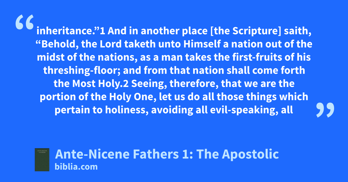 inheritance.”1 And in another place [the Scripture] saith, “Behold, the Lord taketh unto Himself a nation out of the midst of the nations, as a man takes the first-fruits of his threshing-floor; and from that nation shall come forth the Most Holy.2 Seeing, therefore, that we are the portion of the Holy One, let us do all those things which pertain to holiness, avoiding all evil-speaking, all