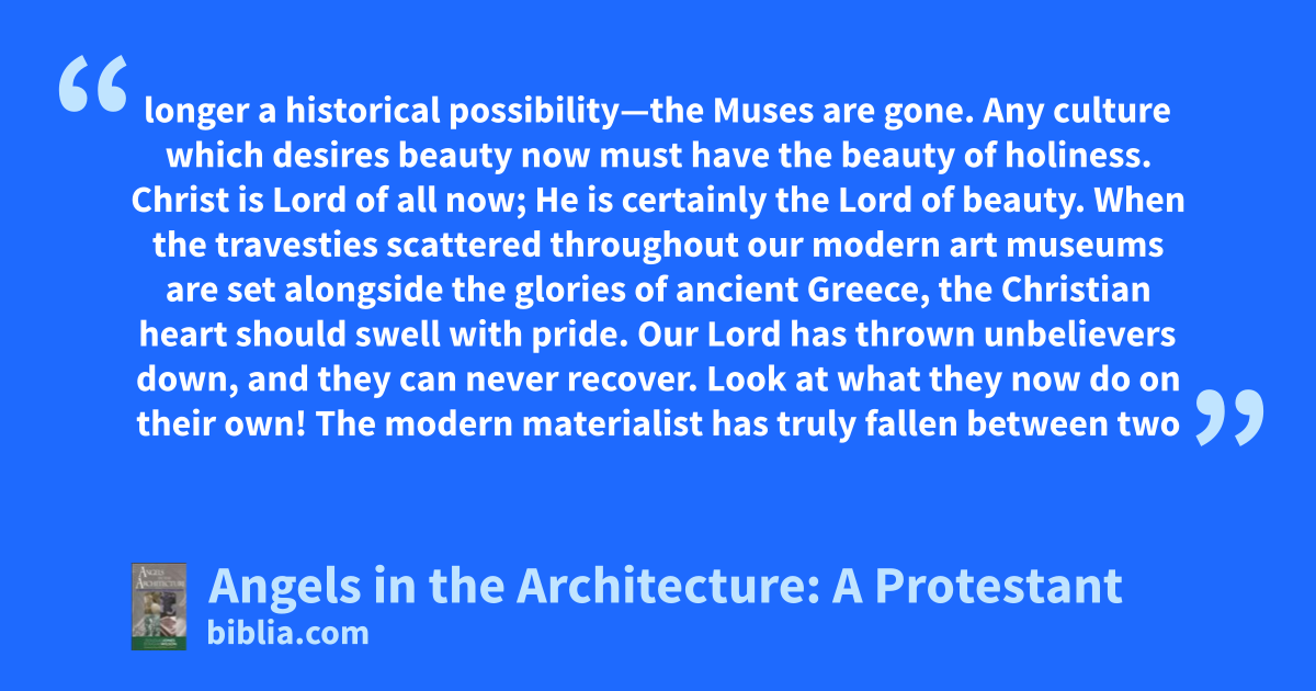 longer a historical possibility—the Muses are gone. Any culture which desires beauty now must have the beauty of holiness. Christ is Lord of all now; He is certainly the Lord of beauty. When the travesties scattered throughout our modern art museums are set alongside the glories of ancient Greece, the Christian heart should swell with pride. Our Lord has thrown unbelievers down, and they can never recover. Look at what they now do on their own! The modern materialist has truly fallen between two