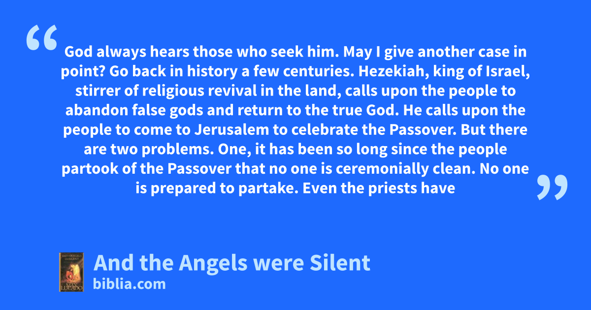 God always hears those who seek him. May I give another case in point? Go back in history a few centuries. Hezekiah, king of Israel, stirrer of religious revival in the land, calls upon the people to abandon false gods and return to the true God. He calls upon the people to come to Jerusalem to celebrate the Passover. But there are two problems. One, it has been so long since the people partook of the Passover that no one is ceremonially clean. No one is prepared to partake. Even the priests have