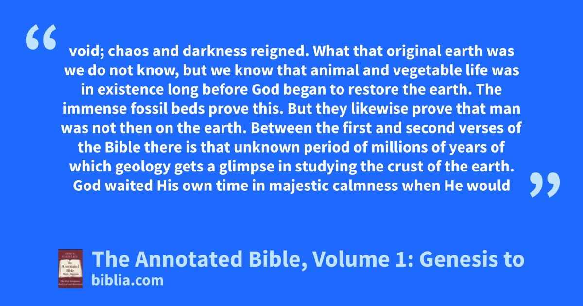 void; chaos and darkness reigned. What that original earth was we do not know, but we know that animal and vegetable life was in existence long before God began to restore the earth. The immense fossil beds prove this. But they likewise prove that man was not then on the earth. Between the first and second verses of the Bible there is that unknown period of millions of years of which geology gets a glimpse in studying the crust of the earth. God waited His own time in majestic calmness when He would