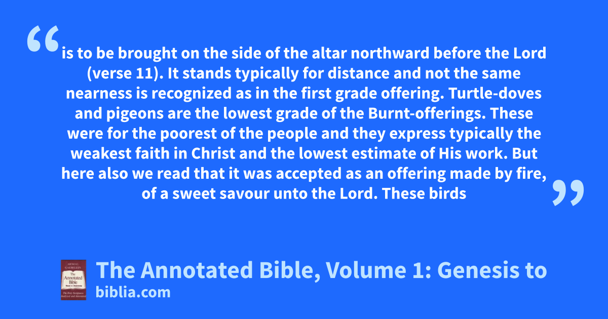 is to be brought on the side of the altar northward before the Lord (verse 11). It stands typically for distance and not the same nearness is recognized as in the first grade offering. Turtle-doves and pigeons are the lowest grade of the Burnt-offerings. These were for the poorest of the people and they express typically the weakest faith in Christ and the lowest estimate of His work. But here also we read that it was accepted as an offering made by fire, of a sweet savour unto the Lord. These birds