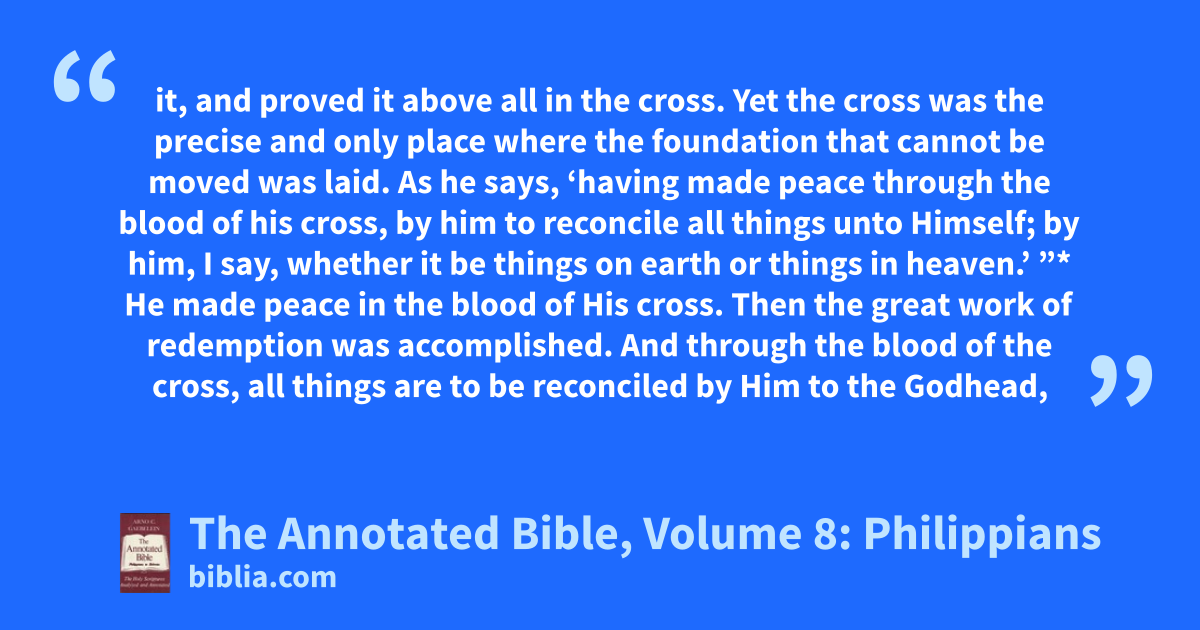 it, and proved it above all in the cross. Yet the cross was the precise and only place where the foundation that cannot be moved was laid. As he says, ‘having made peace through the blood of his cross, by him to reconcile all things unto Himself; by him, I say, whether it be things on earth or things in heaven.’ ”* He made peace in the blood of His cross. Then the great work of redemption was accomplished. And through the blood of the cross, all things are to be reconciled by Him to the Godhead,