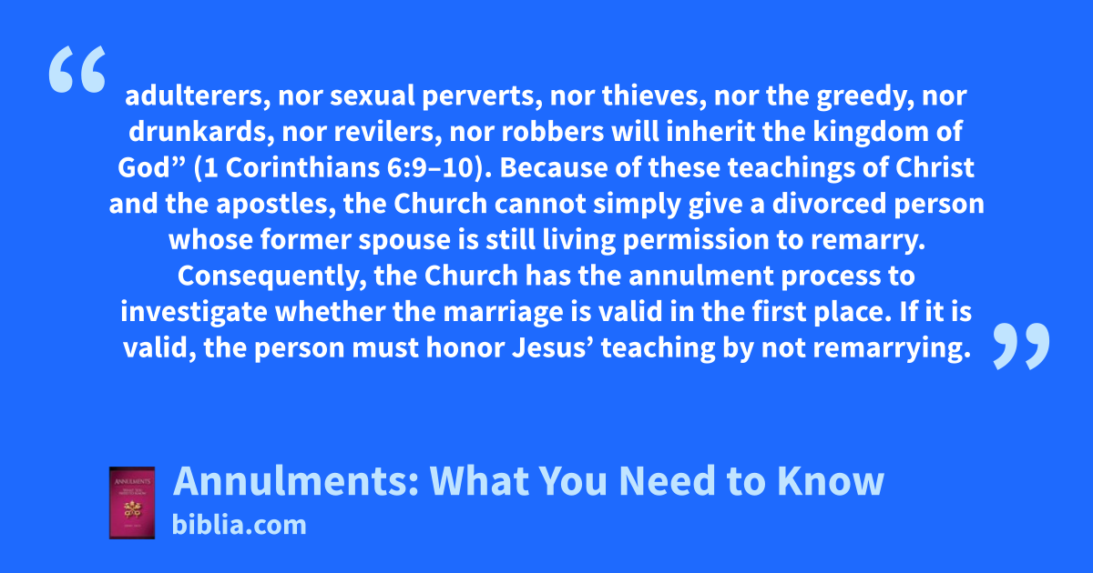 adulterers, nor sexual perverts, nor thieves, nor the greedy, nor drunkards, nor revilers, nor robbers will inherit the kingdom of God” (1 Corinthians 6:9–10). Because of these teachings of Christ and the apostles, the Church cannot simply give a divorced person whose former spouse is still living permission to remarry. Consequently, the Church has the annulment process to investigate whether the marriage is valid in the first place. If it is valid, the person must honor Jesus’ teaching by not remarrying.