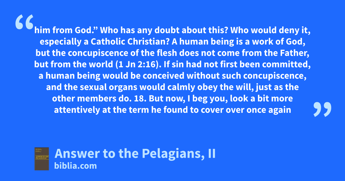 him from God.” Who has any doubt about this? Who would deny it, especially a Catholic Christian? A human being is a work of God, but the concupiscence of the flesh does not come from the Father, but from the world (1 Jn 2:16). If sin had not first been committed, a human being would be conceived without such concupiscence, and the sexual organs would calmly obey the will, just as the other members do. 18. But now, I beg you, look a bit more attentively at the term he found to cover over once again