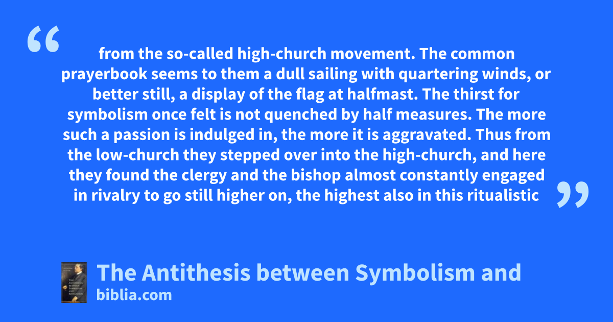from the so-called high-church movement. The common prayerbook seems to them a dull sailing with quartering winds, or better still, a display of the flag at halfmast. The thirst for symbolism once felt is not quenched by half measures. The more such a passion is indulged in, the more it is aggravated. Thus from the low-church they stepped over into the high-church, and here they found the clergy and the bishop almost constantly engaged in rivalry to go still higher on, the highest also in this ritualistic