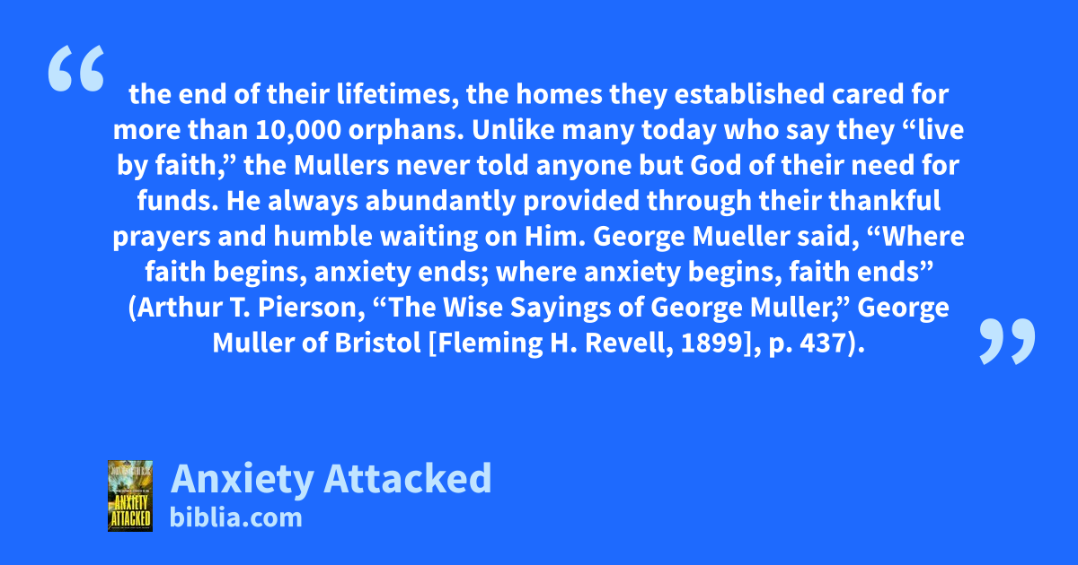 the end of their lifetimes, the homes they established cared for more than 10,000 orphans. Unlike many today who say they “live by faith,” the Mullers never told anyone but God of their need for funds. He always abundantly provided through their thankful prayers and humble waiting on Him. George Mueller said, “Where faith begins, anxiety ends; where anxiety begins, faith ends” (Arthur T. Pierson, “The Wise Sayings of George Muller,” George Muller of Bristol [Fleming H. Revell, 1899], p. 437).