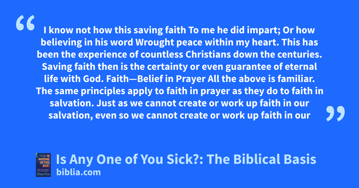 I know not how this saving faith To me he did impart; Or how believing in his word Wrought peace within my heart. This has been the experience of countless Christians down the centuries. Saving faith then is the certainty or even guarantee of eternal life with God. Faith—Belief in Prayer All the above is familiar. The same principles apply to faith in prayer as they do to faith in salvation. Just as we cannot create or work up faith in our salvation, even so we cannot create or work up faith in our