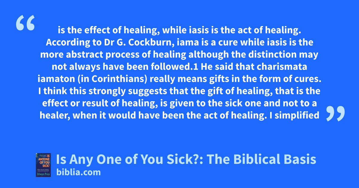 is the effect of healing, while iasis is the act of healing. According to Dr G. Cockburn, iama is a cure while iasis is the more abstract process of healing although the distinction may not always have been followed.1 He said that charismata iamaton (in Corinthians) really means gifts in the form of cures. I think this strongly suggests that the gift of healing, that is the effect or result of healing, is given to the sick one and not to a healer, when it would have been the act of healing. I simplified