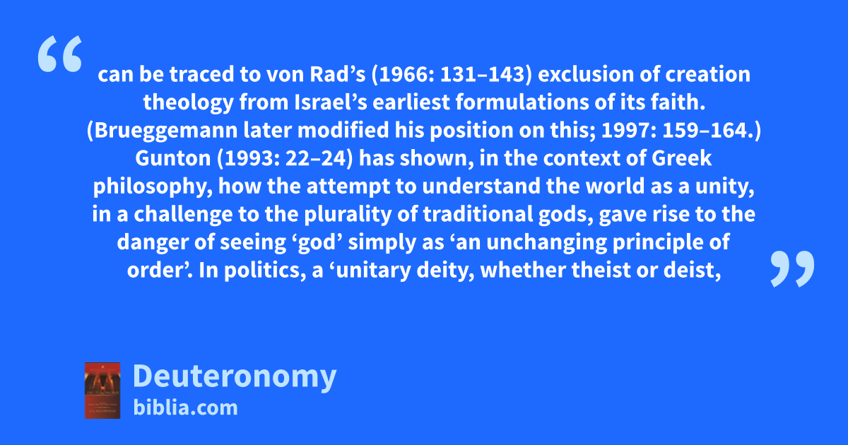 can be traced to von Rad’s (1966: 131–143) exclusion of creation theology from Israel’s earliest formulations of its faith. (Brueggemann later modified his position on this; 1997: 159–164.) Gunton (1993: 22–24) has shown, in the context of Greek philosophy, how the attempt to understand the world as a unity, in a challenge to the plurality of traditional gods, gave rise to the danger of seeing ‘god’ simply as ‘an unchanging principle of order’. In politics, a ‘unitary deity, whether theist or deist,