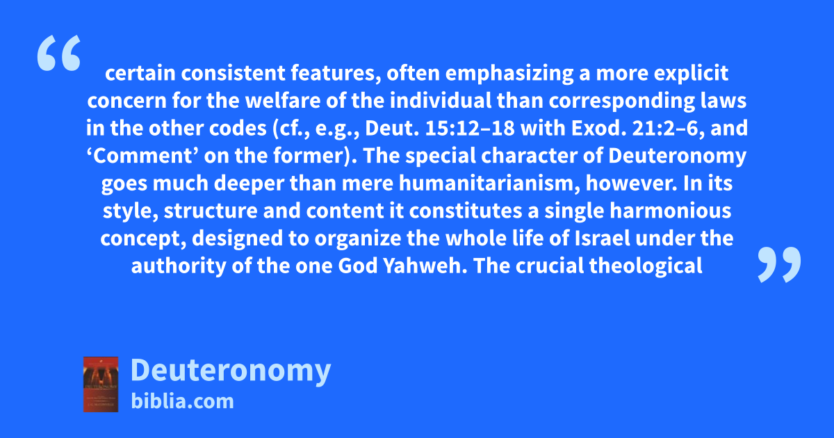 certain consistent features, often emphasizing a more explicit concern for the welfare of the individual than corresponding laws in the other codes (cf., e.g., Deut. 15:12–18 with Exod. 21:2–6, and ‘Comment’ on the former). The special character of Deuteronomy goes much deeper than mere humanitarianism, however. In its style, structure and content it constitutes a single harmonious concept, designed to organize the whole life of Israel under the authority of the one God Yahweh. The crucial theological
