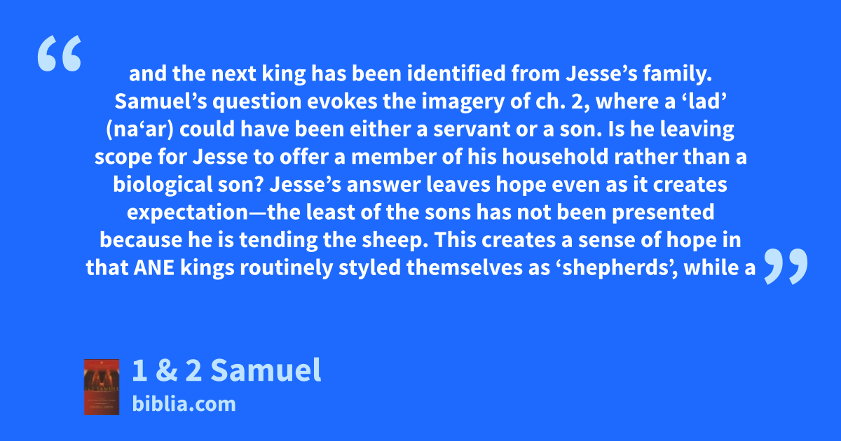 and the next king has been identified from Jesse’s family. Samuel’s question evokes the imagery of ch. 2, where a ‘lad’ (na‘ar) could have been either a servant or a son. Is he leaving scope for Jesse to offer a member of his household rather than a biological son? Jesse’s answer leaves hope even as it creates expectation—the least of the sons has not been presented because he is tending the sheep. This creates a sense of hope in that ANE kings routinely styled themselves as ‘shepherds’, while a