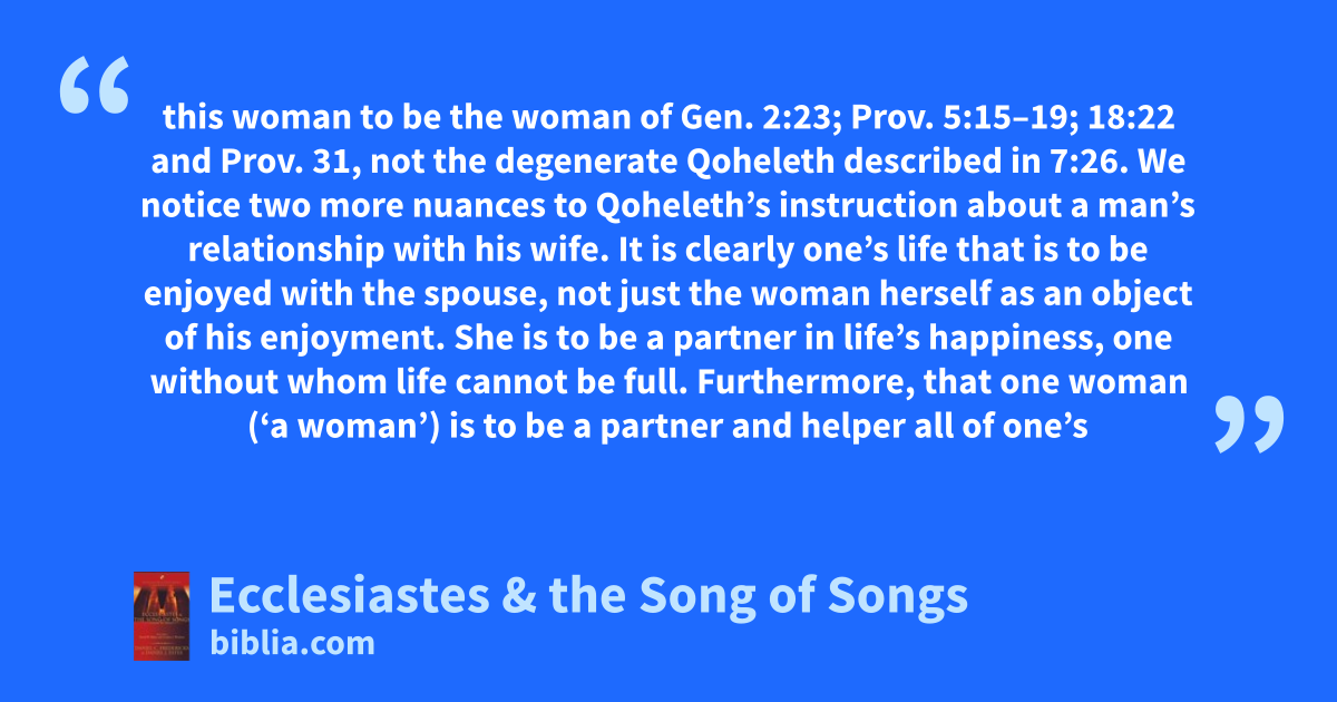 this woman to be the woman of Gen. 2:23; Prov. 5:15–19; 18:22 and Prov. 31, not the degenerate Qoheleth described in 7:26. We notice two more nuances to Qoheleth’s instruction about a man’s relationship with his wife. It is clearly one’s life that is to be enjoyed with the spouse, not just the woman herself as an object of his enjoyment. She is to be a partner in life’s happiness, one without whom life cannot be full. Furthermore, that one woman (‘a woman’) is to be a partner and helper all of one’s