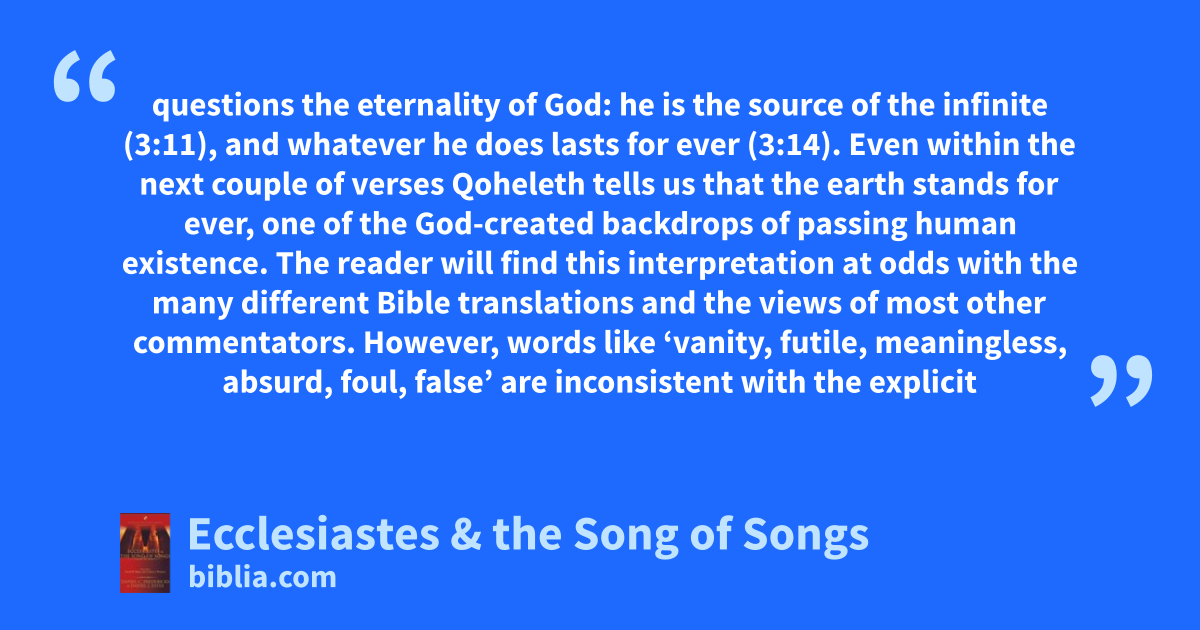 questions the eternality of God: he is the source of the infinite (3:11), and whatever he does lasts for ever (3:14). Even within the next couple of verses Qoheleth tells us that the earth stands for ever, one of the God-created backdrops of passing human existence. The reader will find this interpretation at odds with the many different Bible translations and the views of most other commentators. However, words like ‘vanity, futile, meaningless, absurd, foul, false’ are inconsistent with the explicit