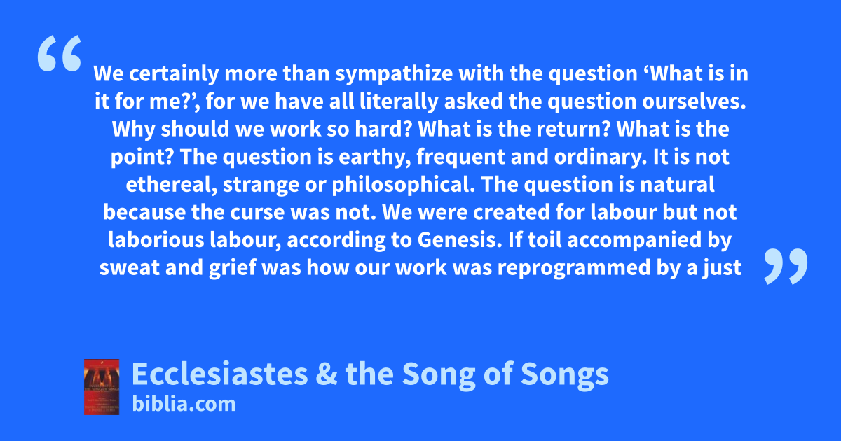 We certainly more than sympathize with the question ‘What is in it for me?’, for we have all literally asked the question ourselves. Why should we work so hard? What is the return? What is the point? The question is earthy, frequent and ordinary. It is not ethereal, strange or philosophical. The question is natural because the curse was not. We were created for labour but not laborious labour, according to Genesis. If toil accompanied by sweat and grief was how our work was reprogrammed by a just