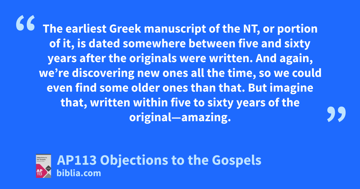 The earliest Greek manuscript of the NT, or portion of it, is dated somewhere between five and sixty years after the originals were written. And again, we’re discovering new ones all the time, so we could even find some older ones than that. But imagine that, written within five to sixty years of the original—amazing.