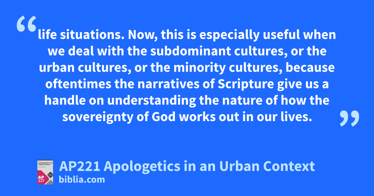 life situations. Now, this is especially useful when we deal with the subdominant cultures, or the urban cultures, or the minority cultures, because oftentimes the narratives of Scripture give us a handle on understanding the nature of how the sovereignty of God works out in our lives.