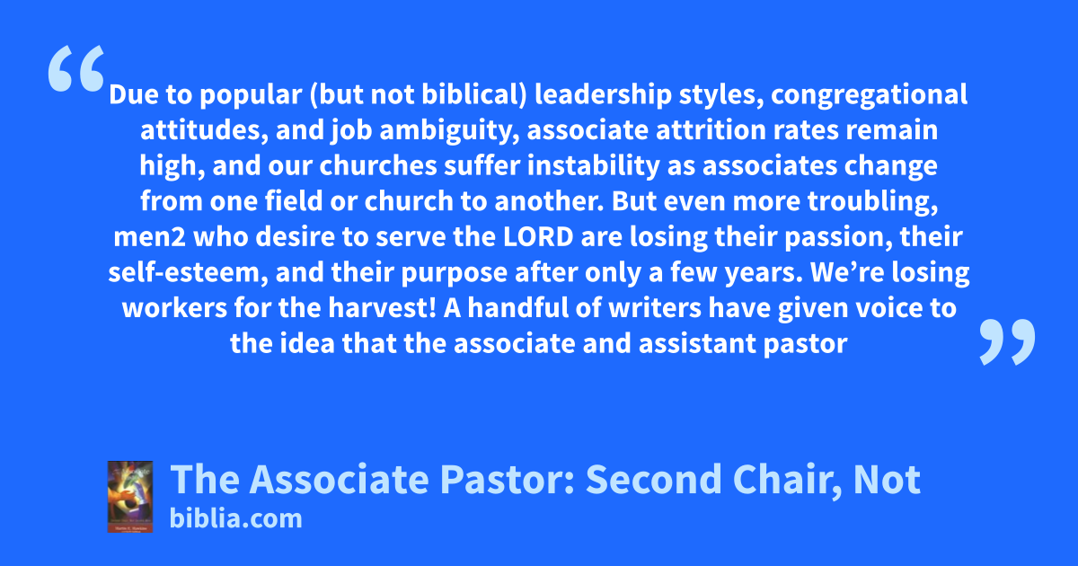 Due to popular (but not biblical) leadership styles, congregational attitudes, and job ambiguity, associate attrition rates remain high, and our churches suffer instability as associates change from one field or church to another. But even more troubling, men2 who desire to serve the LORD are losing their passion, their self-esteem, and their purpose after only a few years. We’re losing workers for the harvest! A handful of writers have given voice to the idea that the associate and assistant pastor