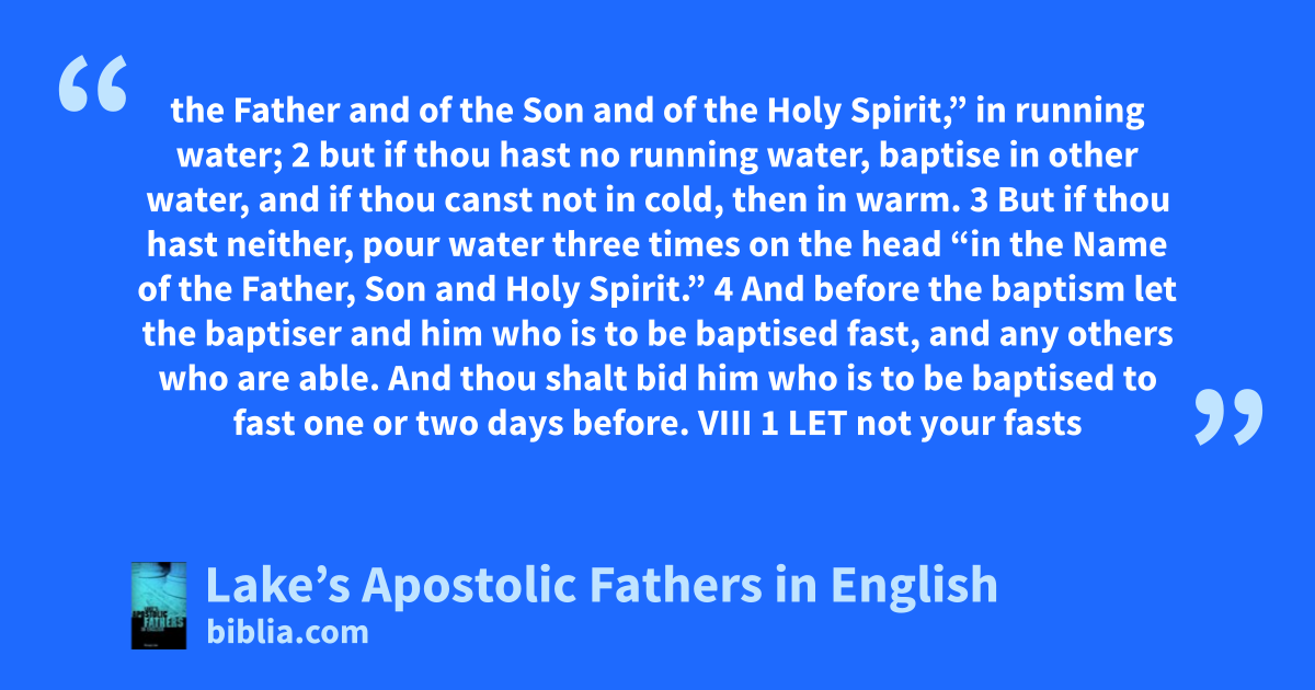 the Father and of the Son and of the Holy Spirit,” in running water; 2 but if thou hast no running water, baptise in other water, and if thou canst not in cold, then in warm. 3 But if thou hast neither, pour water three times on the head “in the Name of the Father, Son and Holy Spirit.” 4 And before the baptism let the baptiser and him who is to be baptised fast, and any others who are able. And thou shalt bid him who is to be baptised to fast one or two days before. VIII 1 LET not your fasts