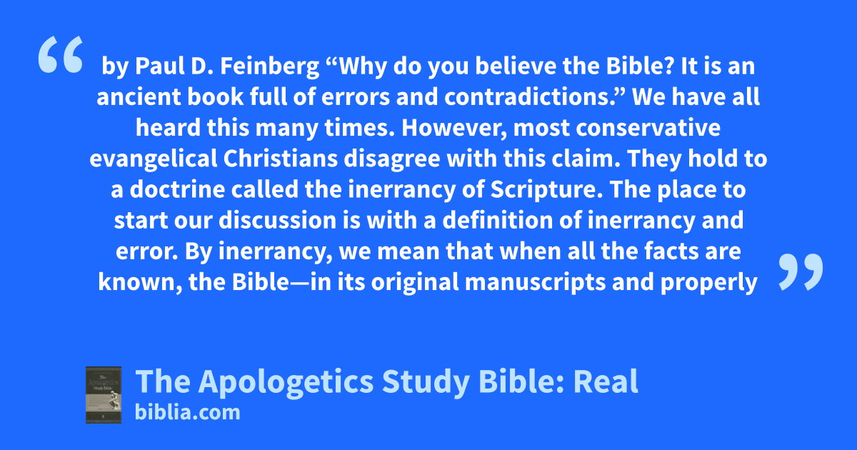 by Paul D. Feinberg “Why do you believe the Bible? It is an ancient book full of errors and contradictions.” We have all heard this many times. However, most conservative evangelical Christians disagree with this claim. They hold to a doctrine called the inerrancy of Scripture. The place to start our discussion is with a definition of inerrancy and error. By inerrancy, we mean that when all the facts are known, the Bible—in its original manuscripts and properly