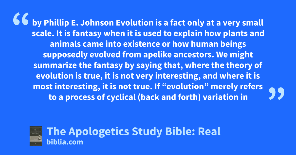 by Phillip E. Johnson Evolution is a fact only at a very small scale. It is fantasy when it is used to explain how plants and animals came into existence or how human beings supposedly evolved from apelike ancestors. We might summarize the fantasy by saying that, where the theory of evolution is true, it is not very interesting, and where it is most interesting, it is not true. If “evolution” merely refers to a process of cyclical (back and forth) variation in