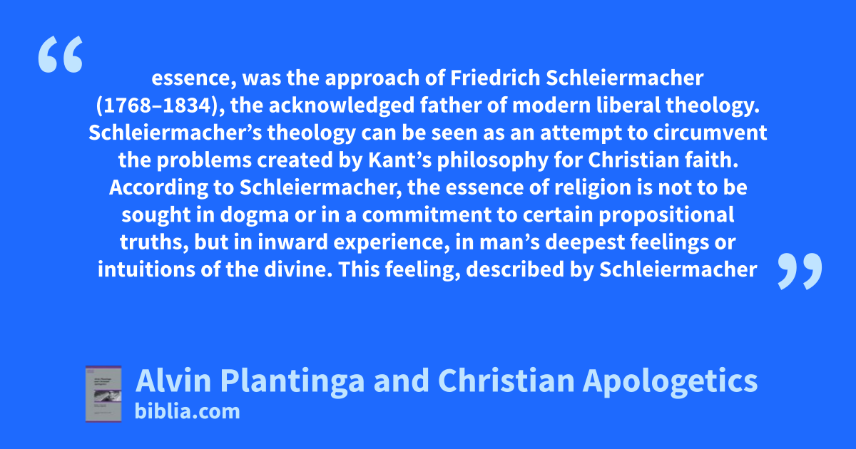 essence, was the approach of Friedrich Schleiermacher (1768–1834), the acknowledged father of modern liberal theology. Schleiermacher’s theology can be seen as an attempt to circumvent the problems created by Kant’s philosophy for Christian faith. According to Schleiermacher, the essence of religion is not to be sought in dogma or in a commitment to certain propositional truths, but in inward experience, in man’s deepest feelings or intuitions of the divine. This feeling, described by Schleiermacher