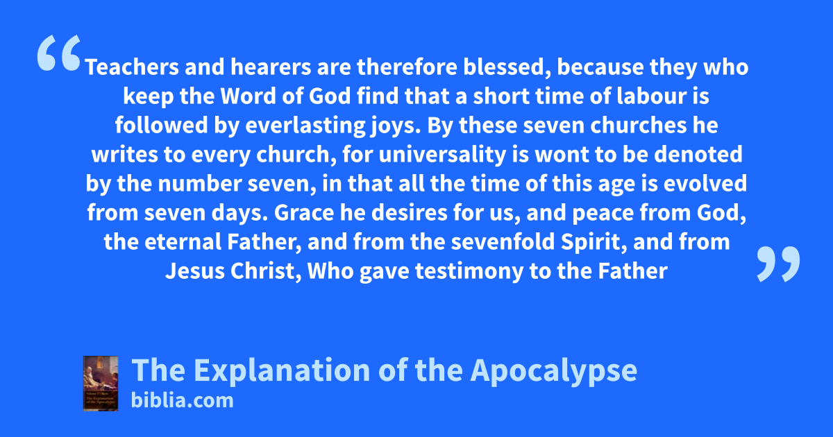 Teachers and hearers are therefore blessed, because they who keep the Word of God find that a short time of labour is followed by everlasting joys. By these seven churches he writes to every church, for universality is wont to be denoted by the number seven, in that all the time of this age is evolved from seven days. Grace he desires for us, and peace from God, the eternal Father, and from the sevenfold Spirit, and from Jesus Christ, Who gave testimony to the Father