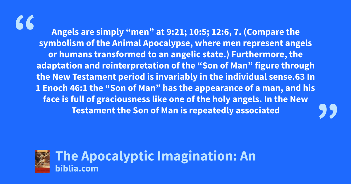 Angels are simply “men” at 9:21; 10:5; 12:6, 7. (Compare the symbolism of the Animal Apocalypse, where men represent angels or humans transformed to an angelic state.) Furthermore, the adaptation and reinterpretation of the “Son of Man” figure through the New Testament period is invariably in the individual sense.63 In 1 Enoch 46:1 the “Son of Man” has the appearance of a man, and his face is full of graciousness like one of the holy angels. In the New Testament the Son of Man is repeatedly associated