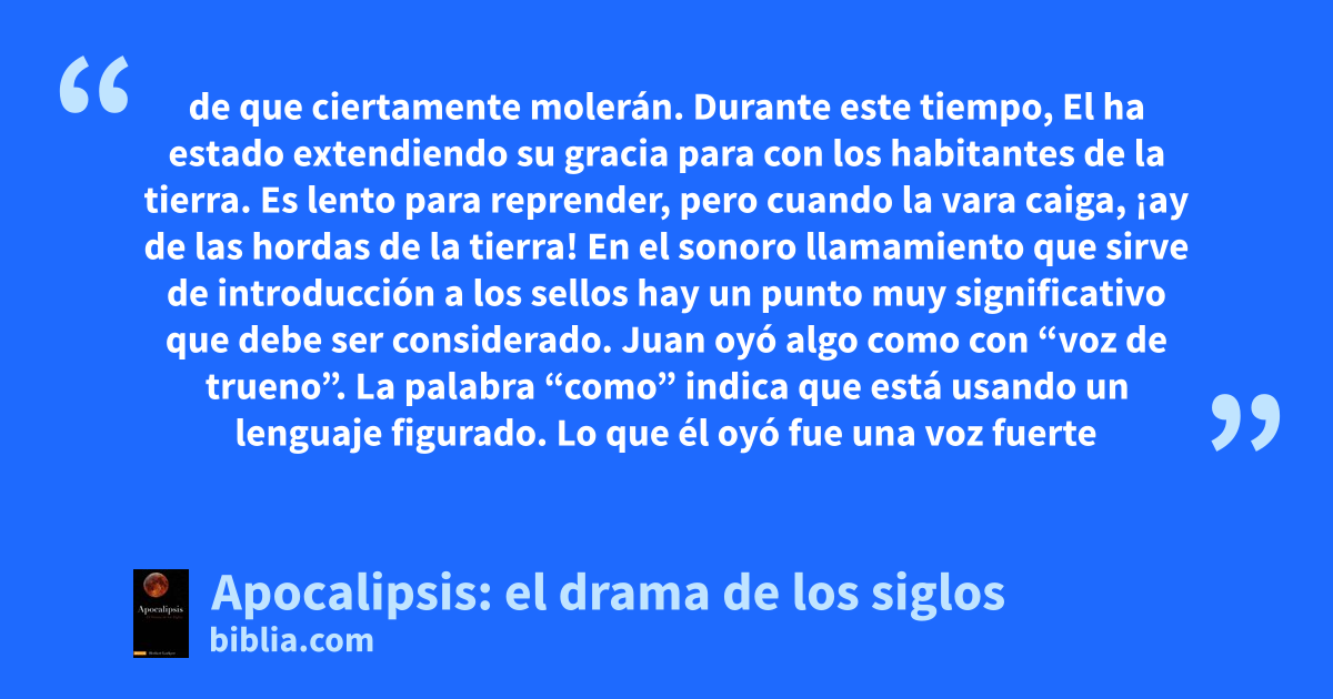 de que ciertamente molerán. Durante este tiempo, El ha estado extendiendo su gracia para con los habitantes de la tierra. Es lento para reprender, pero cuando la vara caiga, ¡ay de las hordas de la tierra! En el sonoro llamamiento que sirve de introducción a los sellos hay un punto muy significativo que debe ser considerado. Juan oyó algo como con “voz de trueno”. La palabra “como” indica que está usando un lenguaje figurado. Lo que él oyó fue una voz fuerte