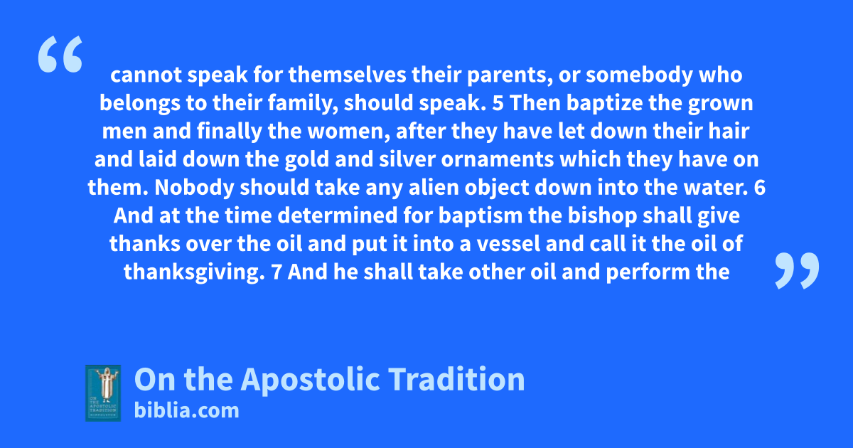 cannot speak for themselves their parents, or somebody who belongs to their family, should speak. 5 Then baptize the grown men and finally the women, after they have let down their hair and laid down the gold and silver ornaments which they have on them. Nobody should take any alien object down into the water. 6 And at the time determined for baptism the bishop shall give thanks over the oil and put it into a vessel and call it the oil of thanksgiving. 7 And he shall take other oil and perform the