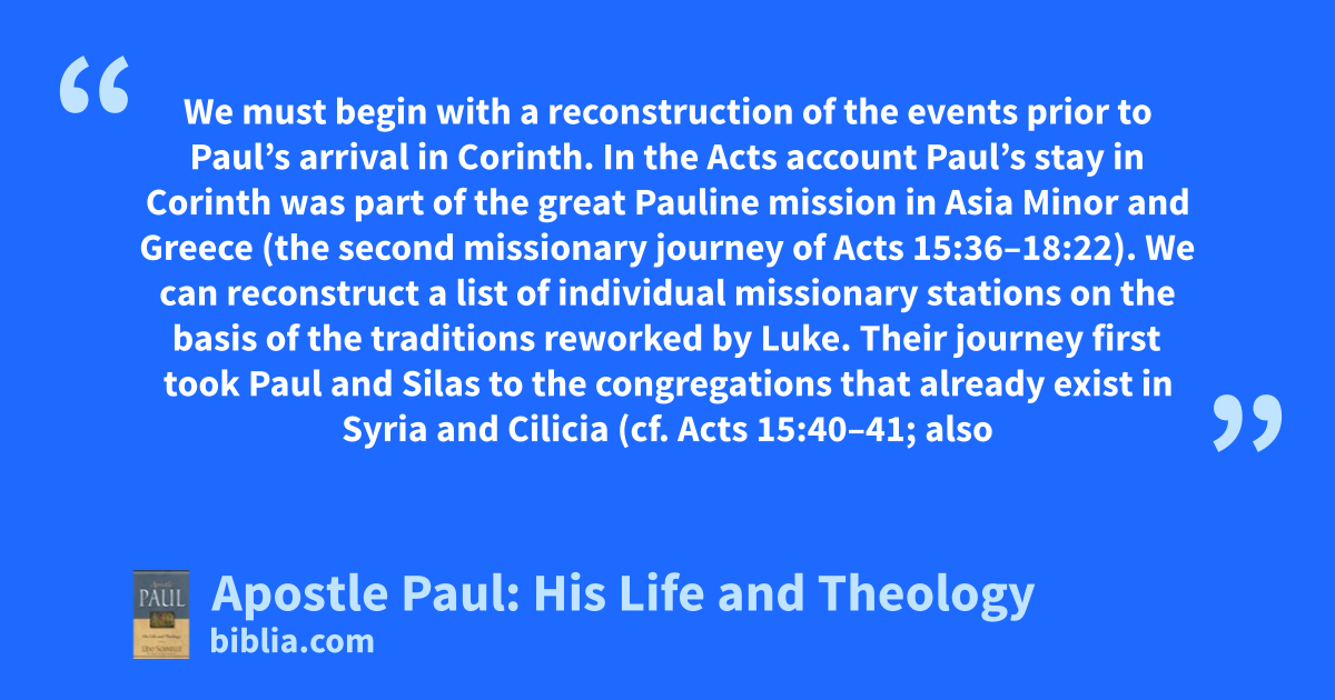 We must begin with a reconstruction of the events prior to Paul’s arrival in Corinth. In the Acts account Paul’s stay in Corinth was part of the great Pauline mission in Asia Minor and Greece (the second missionary journey of Acts 15:36–18:22). We can reconstruct a list of individual missionary stations on the basis of the traditions reworked by Luke. Their journey first took Paul and Silas to the congregations that already exist in Syria and Cilicia (cf. Acts 15:40–41; also