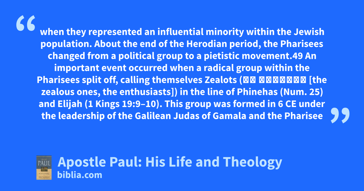 when they represented an influential minority within the Jewish population. About the end of the Herodian period, the Pharisees changed from a political group to a pietistic movement.49 An important event occurred when a radical group within the Pharisees split off, calling themselves Zealots (οἱ ζηλωταί [the zealous ones, the enthusiasts]) in the line of Phinehas (Num. 25) and Elijah (1 Kings 19:9–10). This group was formed in 6 CE under the leadership of the Galilean Judas of Gamala and the Pharisee