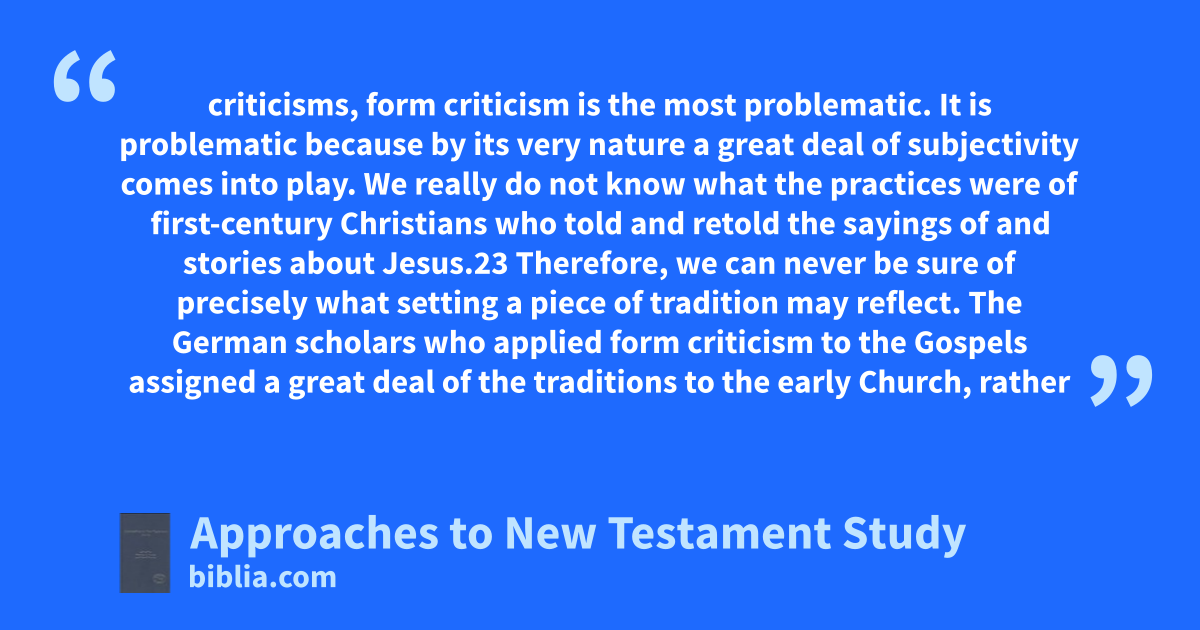 criticisms, form criticism is the most problematic. It is problematic because by its very nature a great deal of subjectivity comes into play. We really do not know what the practices were of first-century Christians who told and retold the sayings of and stories about Jesus.23 Therefore, we can never be sure of precisely what setting a piece of tradition may reflect. The German scholars who applied form criticism to the Gospels assigned a great deal of the traditions to the early Church, rather