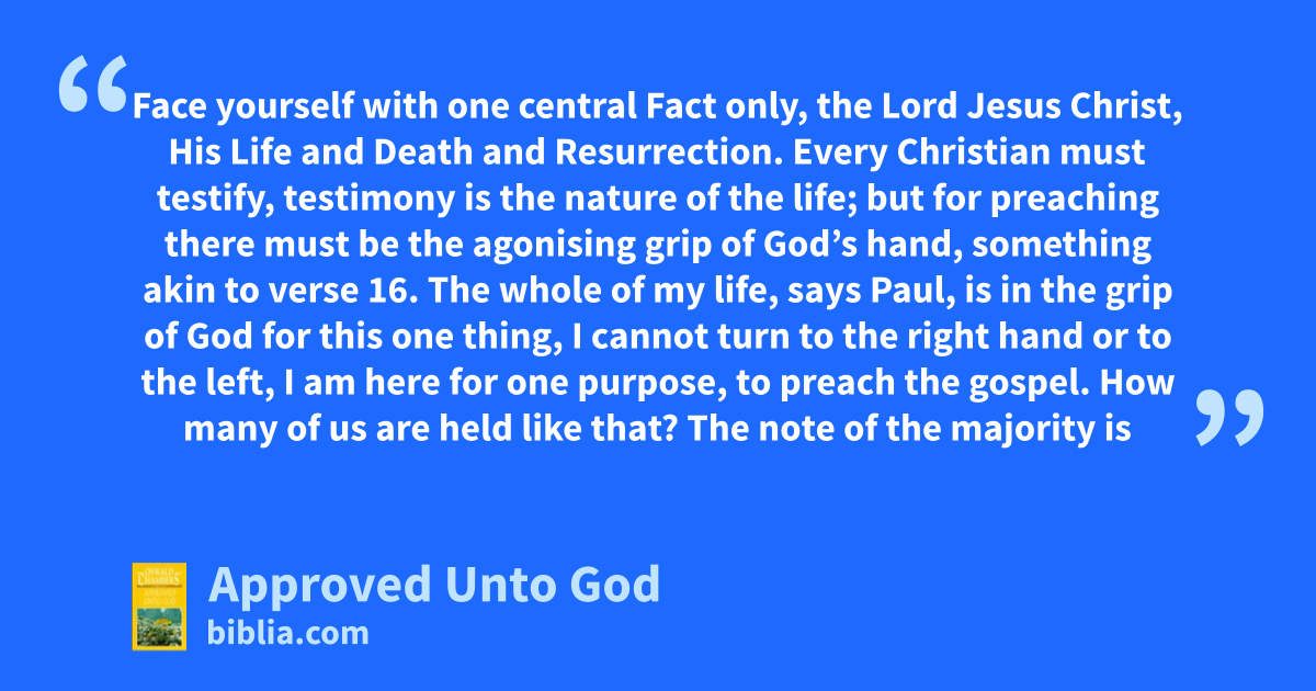 Face yourself with one central Fact only, the Lord Jesus Christ, His Life and Death and Resurrection. Every Christian must testify, testimony is the nature of the life; but for preaching there must be the agonising grip of God’s hand, something akin to verse 16. The whole of my life, says Paul, is in the grip of God for this one thing, I cannot turn to the right hand or to the left, I am here for one purpose, to preach the gospel. How many of us are held like that? The note of the majority is