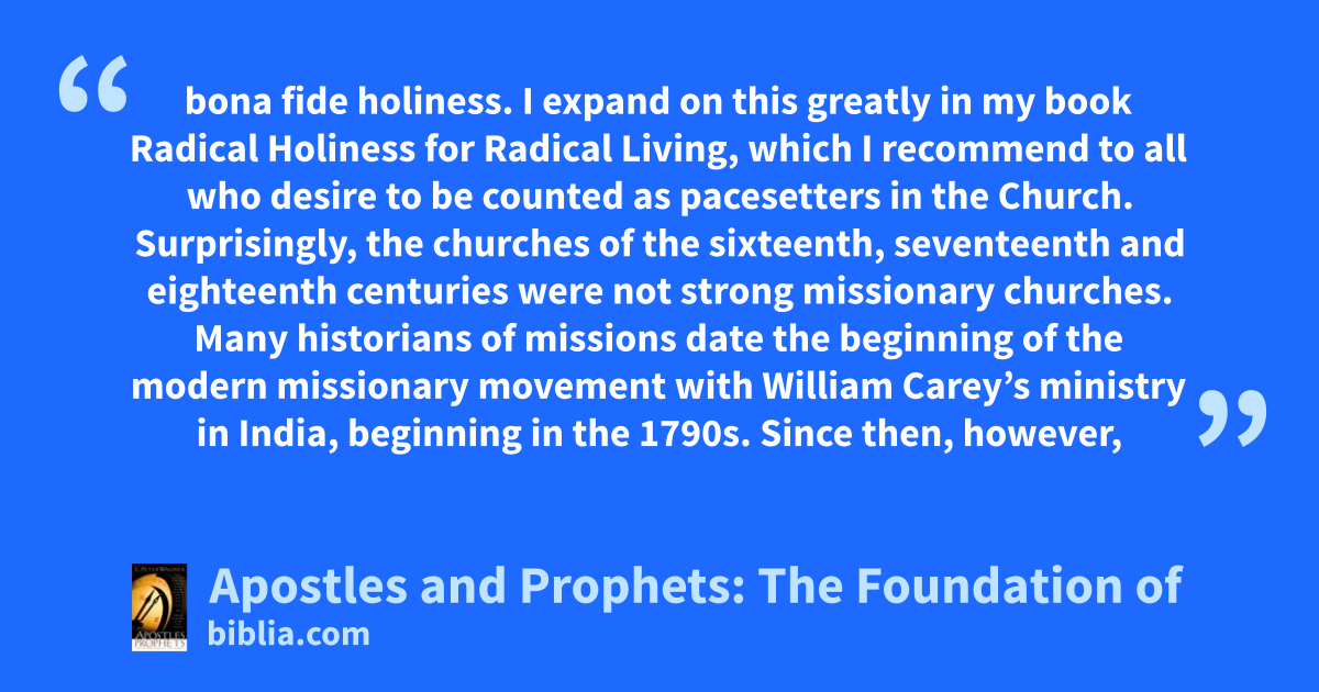 bona fide holiness. I expand on this greatly in my book Radical Holiness for Radical Living, which I recommend to all who desire to be counted as pacesetters in the Church. Surprisingly, the churches of the sixteenth, seventeenth and eighteenth centuries were not strong missionary churches. Many historians of missions date the beginning of the modern missionary movement with William Carey’s ministry in India, beginning in the 1790s. Since then, however,