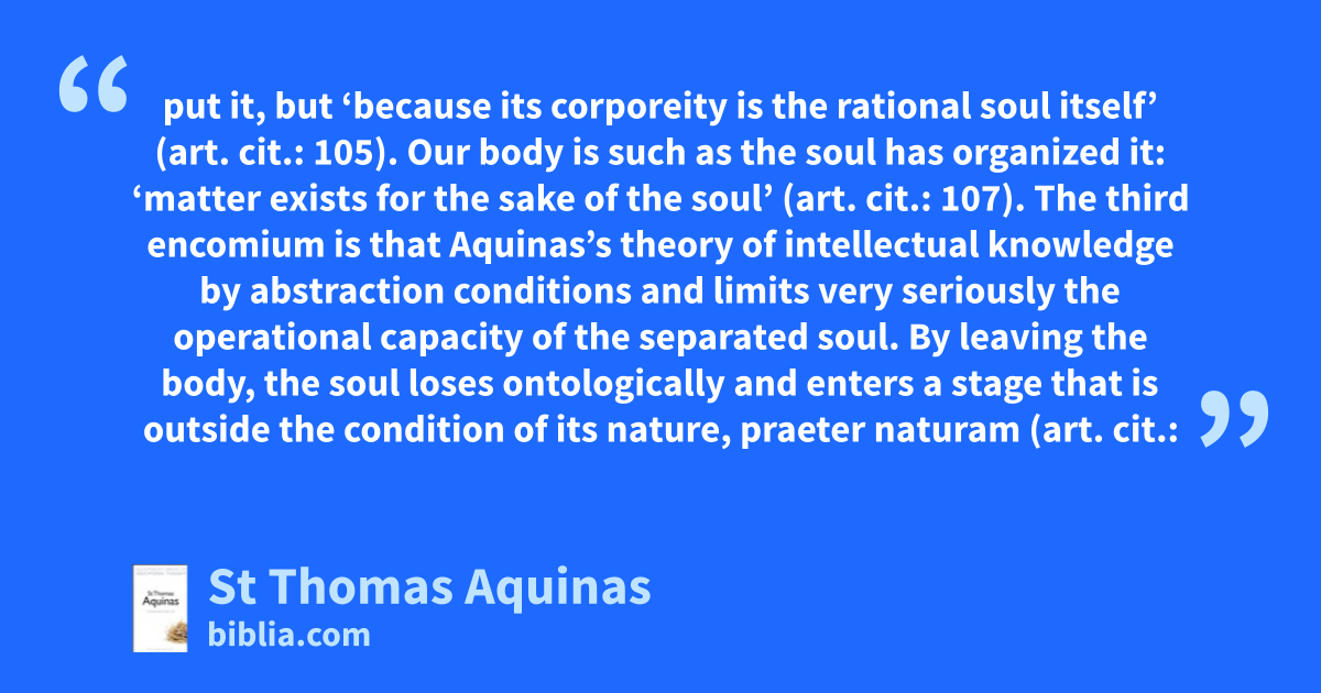 put it, but ‘because its corporeity is the rational soul itself’ (art. cit.: 105). Our body is such as the soul has organized it: ‘matter exists for the sake of the soul’ (art. cit.: 107). The third encomium is that Aquinas’s theory of intellectual knowledge by abstraction conditions and limits very seriously the operational capacity of the separated soul. By leaving the body, the soul loses ontologically and enters a stage that is outside the condition of its nature, praeter naturam (art. cit.: