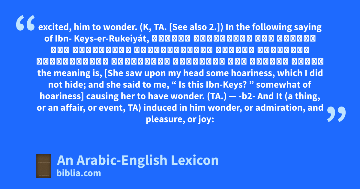 excited, him to wonder. (K, TA. [See also 2.]) In the following saying of Ibn- Keys-er-Rukeiyát, رَأَتْ فِى الرَّأْسِ مِنِّى شَيْبَةً لَسْتُ أُغَيِّبُهَا فَقَالَتْ لِى ابْنُ قَيْسٍ ذَا وَبَعْضُ الشَّيْبِ يُعْجِبُهَا the meaning is, [She saw upon my head some hoariness, which I did not hide; and she said to me, “ Is this Ibn-Keys? ” somewhat of hoariness] causing her to have wonder. (TA.) ― -b2- And It (a thing, or an affair, or event, TA) induced in him wonder, or admiration, and pleasure, or joy:
