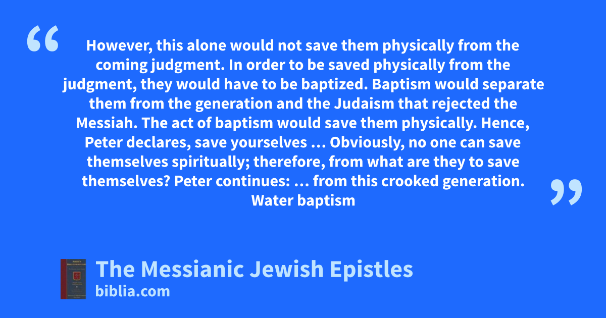 However, this alone would not save them physically from the coming judgment. In order to be saved physically from the judgment, they would have to be baptized. Baptism would separate them from the generation and the Judaism that rejected the Messiah. The act of baptism would save them physically. Hence, Peter declares, save yourselves … Obviously, no one can save themselves spiritually; therefore, from what are they to save themselves? Peter continues: … from this crooked generation. Water baptism